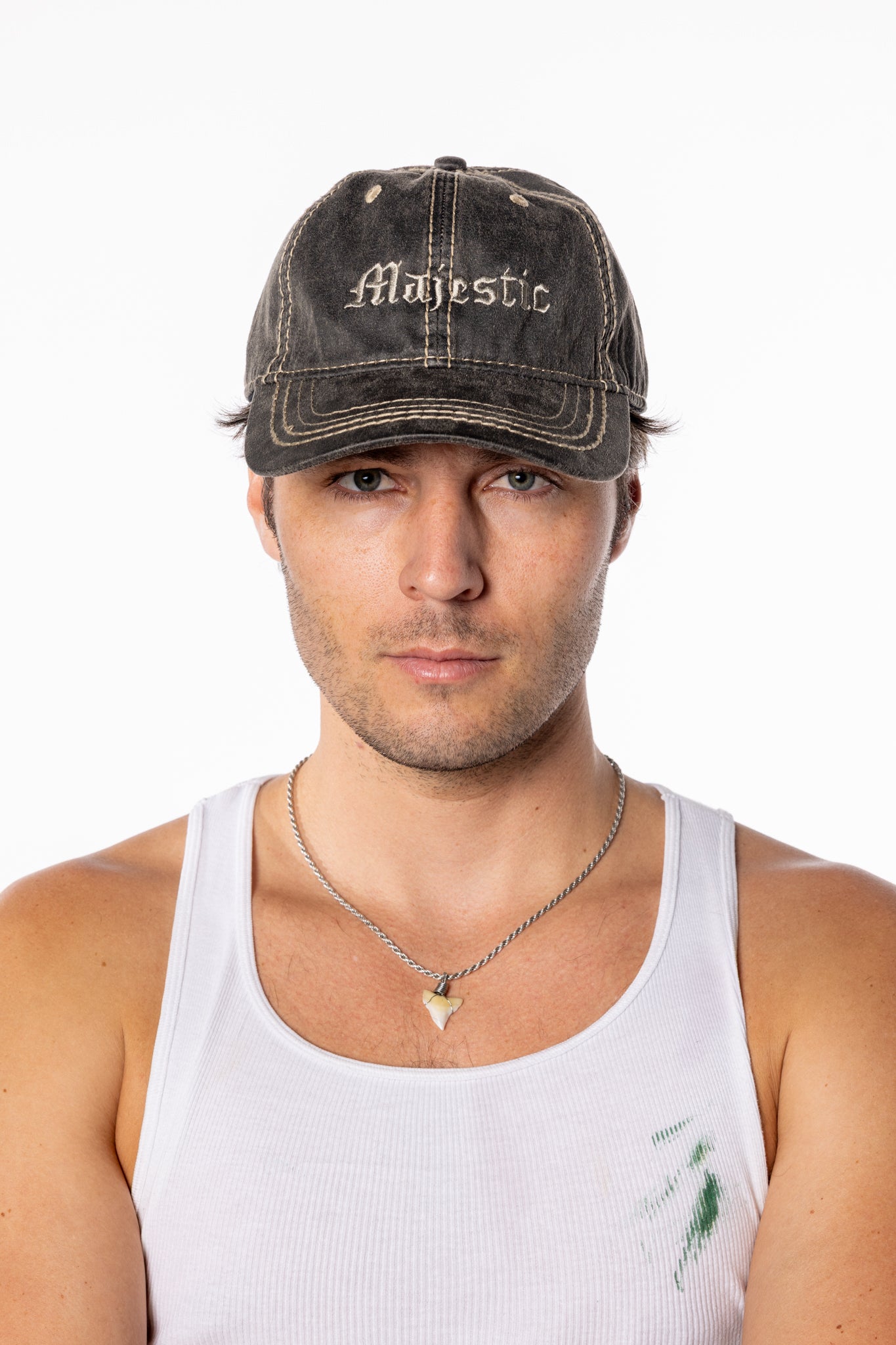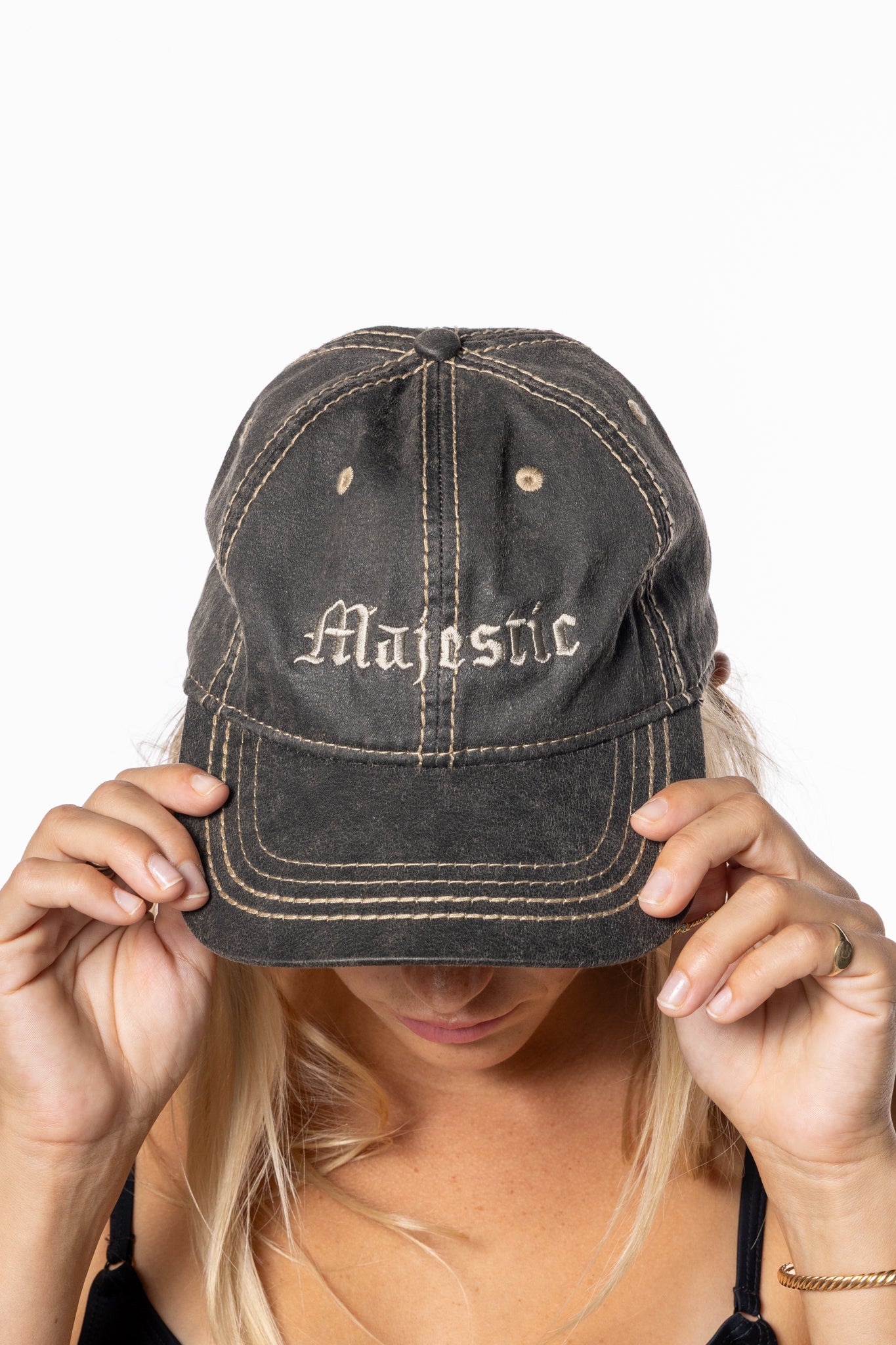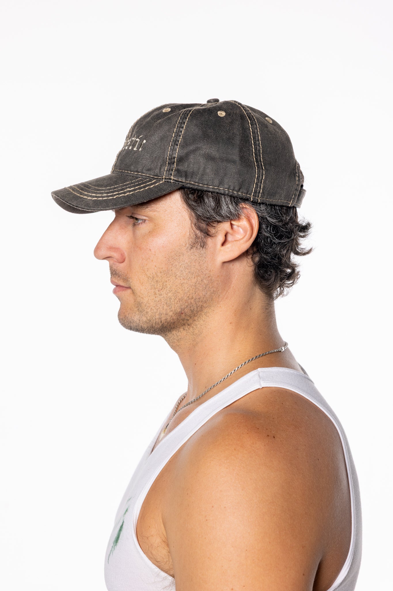 Contrast stitching. Worn-in feel.